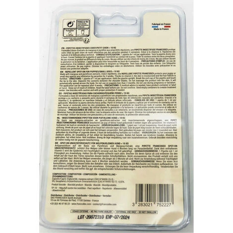 - 4 pipettes = 4 mois de protection (1 pipette par mois)