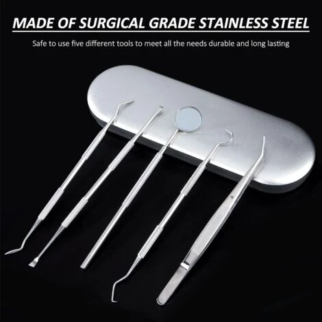 Ensemble d’outils 5 pièces : l’ensemble comprend 1 sonde dentaire, 1 détartreur à faucille, 1 grattoir, 1 miroir buccal, 1 paire de pincettes et 1 étui de rangement, suffisamment pour répondre aux besoins de votre animal en matière de soins bucco-dentaires.