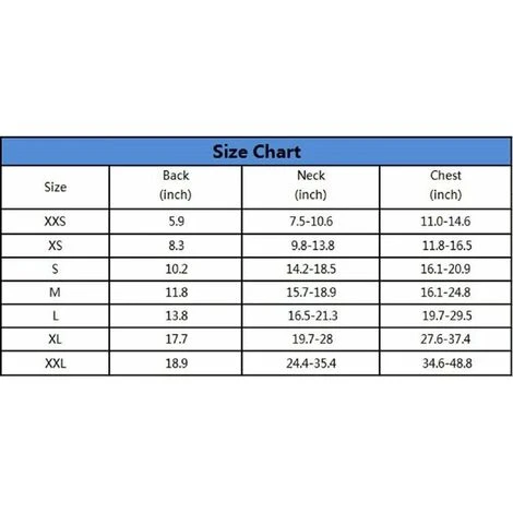 XXS : tour de poitrine : 28 à 37 cm, poids du chien : < 1,8 kg.