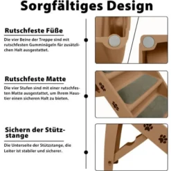 1. Sortez l’échelle pliante pour animaux de compagnie et tirez le grand cadre de support vers l’arrière jusqu’à ce que la boucle de sécurité à l’arrière soit fermée ; 2. Tirez fermement sur la petite barre de support jusqu’à ce que la boucle de sécurité en bas soit fermée, puis poussez fermement jusqu’à ce que vous entendiez un « clic » pour confirmer que le verrou est verrouillé. 3. Mettez des tapis antidérapants dans les escaliers.