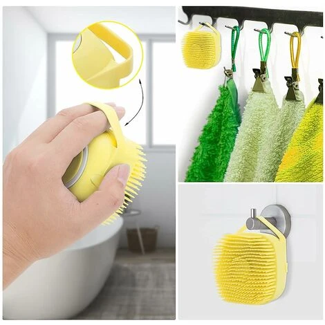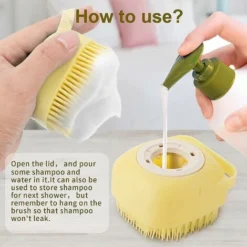 2. En haut du bas, vous pouvez ouvrir le petit anneau et verser du shampoing et de l’eau. Lors de l’utilisation, vous pouvez appuyer sur le bouton en silicone supérieur pour générer de la mousse. Les cheveux lâches, la poussière et la saleté seront délicatement éliminés. Une brosse à poils de chien avec de nombreux petits morceaux mous garantira que la peau et la peau morte de votre animal ne seront pas rayées pendant le bain.