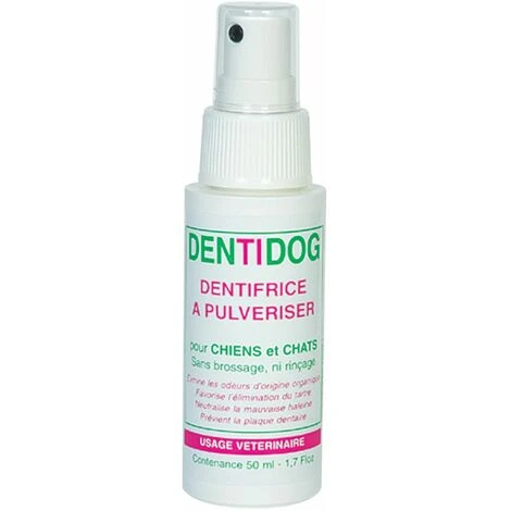 Ce dentifrice à pulvériser pour chien ou chat est idéal pour combattre la mauvaise haleine de votre animal et prévenir l’apparition de plaque dentaire. Sans brossage, ni rinçage, il est facile d’utilisation. Contenance : Spray de 50 ml Dentifrice Dentidog à pulvériser, Pulvériser sur les gencives de votre chien ou chat. Formule concentrée en spray très pratique, Sans brossage, ni rinçage, idéal pour les animaux qui refusent le brossage dentaire, Facile d’application il est efficace sur les irritations gingivales et la mauvaise haleine. Favorise l’élimination du tartre et lutte contre l’apparition de la plaque dentaire, Il protège l’email des dents de votre animal tout en neutralisant la mauvaise haleine instantanément, Peut être utilisé dès le plus jeune âge (dès 6 semaines), Action rapide ne stressant pas votre animal, En spray 50ml. Economique, environ 2 mois d’utilisation.