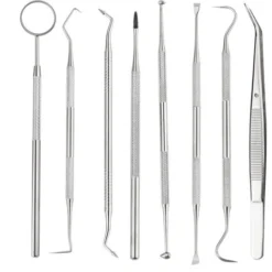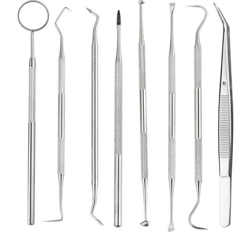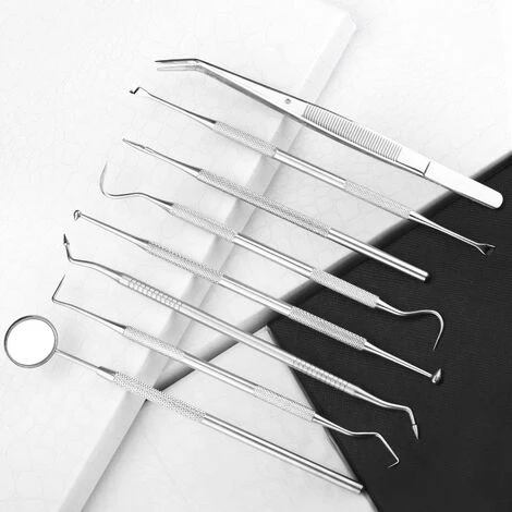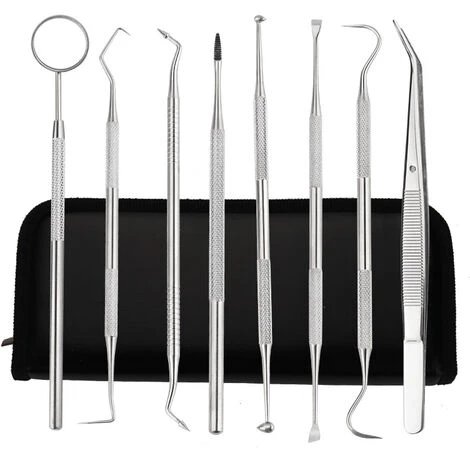 KIT D’ENTRETIEN BUCCAL PROFESSIONNEL 8-EN-1 : Il y a 1 aiguille en forme de marteau, 1 aiguille en dents de scie, 1 aiguille pointue, 1 détartreur dentaire faucille, 1 pince à épiler, 1 sonde, 1 miroir dentaire et 1 détartreur dentaire hack. Il est conçu à la fois pour les dentistes professionnels et pour un usage personnel.