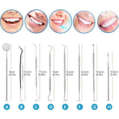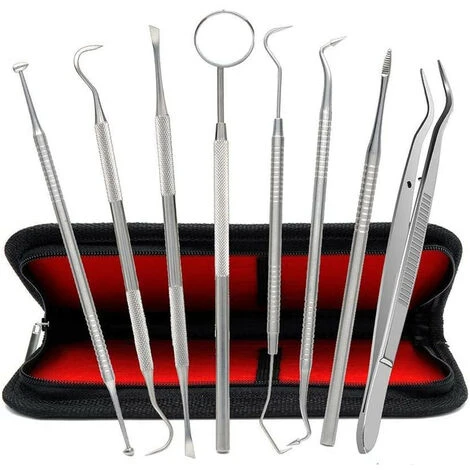 KIT DE SOINS BUCCO-DENTAIRES PROFESSIONNELS 8-EN-1 : Comprend 1 aiguille en forme de marteau, 1 aiguille en dents de scie, 1 aiguille pointue, 1 dissolvant de tartre faucille, 1 pince à épiler, 1 sonde dentaire, 1 miroir de détail et 1 dissolvant de tartre de houe, en particulier pour dentistes professionnels et usage personnel. Tous les grattoirs dentaires sont fabriqués à haute résistance. Ce kit de soins bucco-dentaires antirouille est suffisamment solide et tranchant pour éliminer la plaque et le tartre entre les dents.