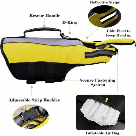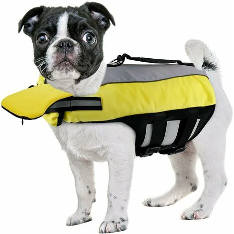 Construction de sécurité multiple : 1. Il y a de la mousse autour du cou et de la mentonnière pour garantir que la tête de l’animal puisse flotter sur l’eau. 2. La poignée solide sur le dos permet à votre animal de compagnie de sortir de l’eau à tout