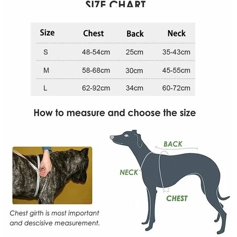 Taille S : tour de cou : 35-43 cm ; tour de poitrine : 48-53 cm ; longueur du dos : 25 cm ; mesurer votre animal de compagnie avant l’achat et choisir la taille appropriée selon le tableau des tailles.