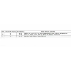 L : longueur du dos : 40 cm ; tour de poitrine : 69 à 85 cm ; tour de cou : 47 à 61 cm ; poids recommandé : 16 à 30 kg.