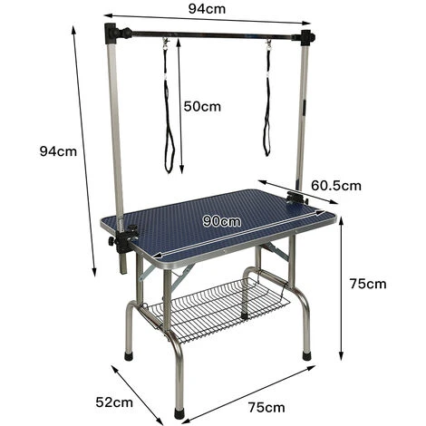▷ Panier de rangement : Il s’agit de plein d’outils pour le toilettage. Le panier sous la table de toilettage animal permet de stocker les ustensiles animaux à proximité : peigne, tondeuse, brosse, serviettes, etc.