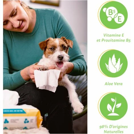 DES INGRÉDIENTS NATURELS : une formule composée à 98 % d’origines naturelles tels que l’Aloe vera, les vitamines E et B5. Également sans alcool, sans parabènes, et hypoallergéniques, ces lingettes nourrissent, hydratent et protègent votre chien des agressions sur sa peau dans le respect et la bienveillance.