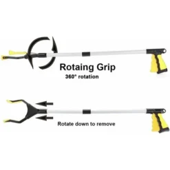 CONCEPTION ROTATIVE ET POIGNÉE FORTE : La mâchoire pivote sur 360 degrés par incréments de 90 pour être utilisée à la fois verticalement et horizontalement afin d’atteindre les endroits difficiles d’accès comme derrière les meubles ou le réfrigérateur. Le bras saisit les objets à l’aide d’une griffe qui peut être maintenue et relâchée par une simple pression sur un bouton.