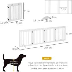– Barrière coloris blanc sobre et moderne en 4 panneaux avec double motif patte de chien sur la partie haute de chaque panneau
