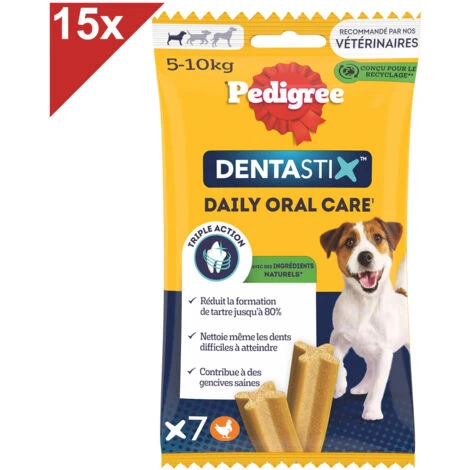 Les bâtonnets à mâcher Pedigree® Dentastix vous aident à garder les dents de votre chien saines et des gencives fortes. Technologie de bâtonnet unique brevetée. En utilisation quotidienne, ce stick dentaire en forme de X unique aide à réduire jusqu’à 80% la formation de tartre. Avec une texture légèrement abrasive conçue pour permettre un frottement sur les dents et des ingrédients actifs qui agissent directement sur la salive qui aide à réduire la formation du tartre. Ces bâtonnets nettoient les dents difficiles à atteindre et contribuent à des gencives saines.