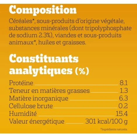 Additifs par kg : Additifs nutritionnels : Vitamine E : 1365 mg, Zinc (Sulfate de zinc heptahydraté) : 193 mg. Additifs sensoriels : arôme poulet : 44,6mg.