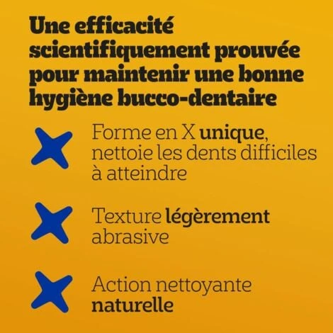 - Forme en X unique, texture légèrement abrasive conçue pour permettre un frottement sur les dents et des ingrédients actifs