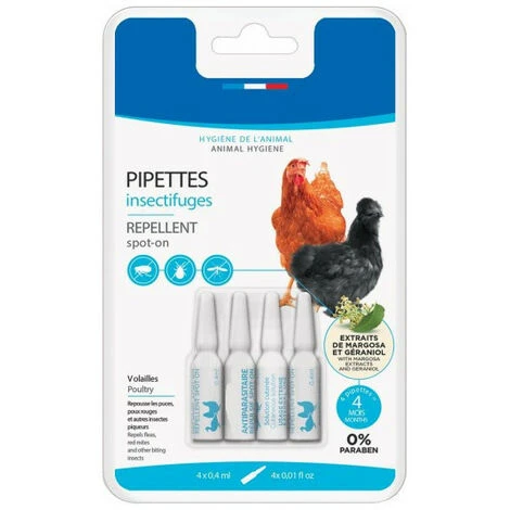 - Formulée à base d’extraits de margosa et de géraniol aux propriétés répulsives, une PIPETTE INSECTIFUGE FRANCODEX protège vos poules, oies et canards de toute infestation par des parasites externes (puces du poulet, poux rouges et autres insectes piqueurs) pendant 4 semaines.