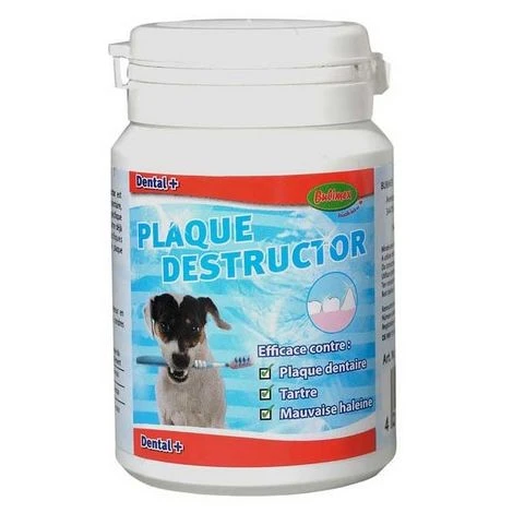 Le nouveau produit innovant Plaque Destructor est conçu pour les chiens présentant de la plaque dentaire, du tartre ou une mauvaise haleine..