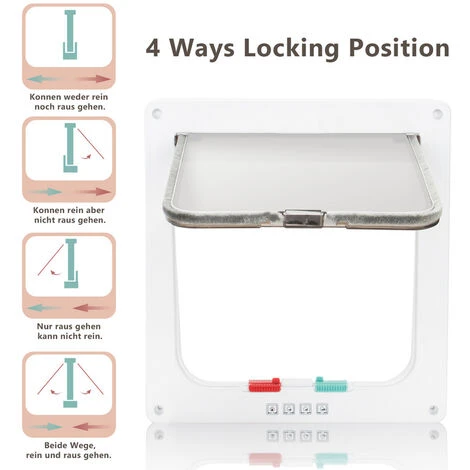 √4 modes de fermeture : la chatière à quatre réglages permet à votre chat d’entrer et de sortir du jardin de manière autonome. Vous n’avez pas à vous soucier du moment où votre animal de compagnie souhaite aller aux toilettes. 4 réglages : ouverture vers