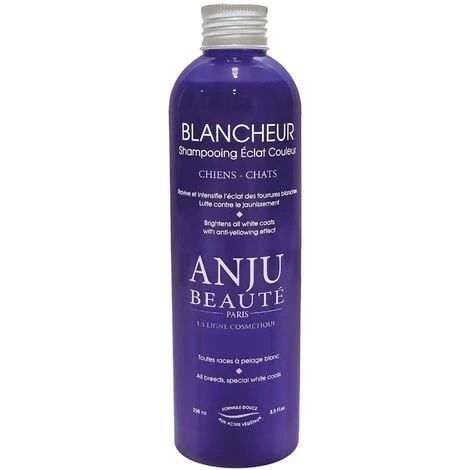 Le shampooing Éclat Blancheur Anju Beauté pour chien et chat permet de raviver l’éclat des fourrures blanches tout en intensifiant la couleur. Pour sublimer la couleur des chiens ou chats à pelage blanc ou clair.Disponible en 250 ml, 1 litre, 2.5 ou 5 litres. Shampooing Éclat Blancheur Anju Beauté pour chien et chat, Spécialement conçu pour les pelages clairs, blancs. Ravive la couleur blanche des fourrures. A base de camomille pour luttee efficacement contre le jaunissement, Les provitamines quant à elles permettent aux poils d’être brillants et hydratés. Comment entretenir le pelage blanc de votre animal tout en luttant contre les reflets jaunes ? A l’aide de notre shampooing, le poil clair de votre compagnon retrouver toute sa lumière naturel, sa couleur est sublimée, les reflets sont neutralisés. Caractéristiques et avantages : Spécial fourrure blanche et claire, Aide à lutter contre le jaunissement, Entretien la couleur naturelle de votre animal, Apporte de la brillance, Taux de dilution : 1/5, Disponible en 250 ml (C1050), 1 litre (C1052), 2.5 (C1120) ou 5 litres (C1054). Attention : Dangereux, respecter les précautions d’emploi.