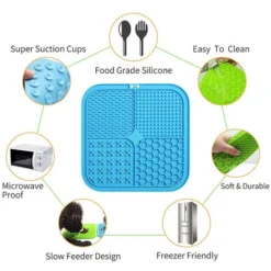 Description du produit Quantité : 1 pièces : bleu, vert Quantité : 2 pièces : bleu et vert 1.【Matériaux sûrs et qualifiés】 Le tapis de nourriture pour chien est fabriqué en silicone de haute qualité, qui est sans danger pour les aliments et n’affectera pas la santé de votre mignon. animaux. 8,1 x 8,1 x 0,4 pouces/20 * 20 * 1 cm, ce coussin pour chien est une taille idéale pour les chats et les chiens de petite et moyenne taille. 2. 【Servez des friandises saines pour chiens】 Les tapis à lécher pour chiens Slow Feeder sont non toxiques et conçus pour la collation préférée de votre animal. Ce tapis d’alimentation pour chien garde votre chien heureux lorsqu’il lèche du beurre de cacahuète, du yaourt, de la purée de citrouille et d’autres friandises approuvées par les animaux de compagnie du tapis de léchage à alimentation lente. 3. 【Réduit l’anxiété, l’ennui et le comportement destructeur】 Aide à calmer et apaiser votre animal de compagnie pour libérer des endorphines grâce à la promotion du léchage. Ce tapis de friandises pour chien est une alternative sûre à lécher pour votre chien. Idéal pour les périodes stressantes telles que les visites chez le vétérinaire, l’heure du bain, la coupe des ongles, la récupération des blessures ainsi que les orages et les feux d’artifice. 4. 【Conception】 Il y a 77 ventouses puissantes à l’arrière de ce tapis de nourriture pour animaux de compagnie pour aider à le fixer sur une surface lisse et propre. Les bords surélevés du motif texturé empêchent les aliments de se répandre et gardent la salle de bain, la douche ou le comptoir propres. 5. 【Tapis d’alimentation multifonction pour chien】 Notre conception unique de coussin à lécher réduit efficacement la vitesse d’alimentation de l’animal et prolonge le temps de repas, réduisant ainsi les ballonnements et améliorant la digestibilité.